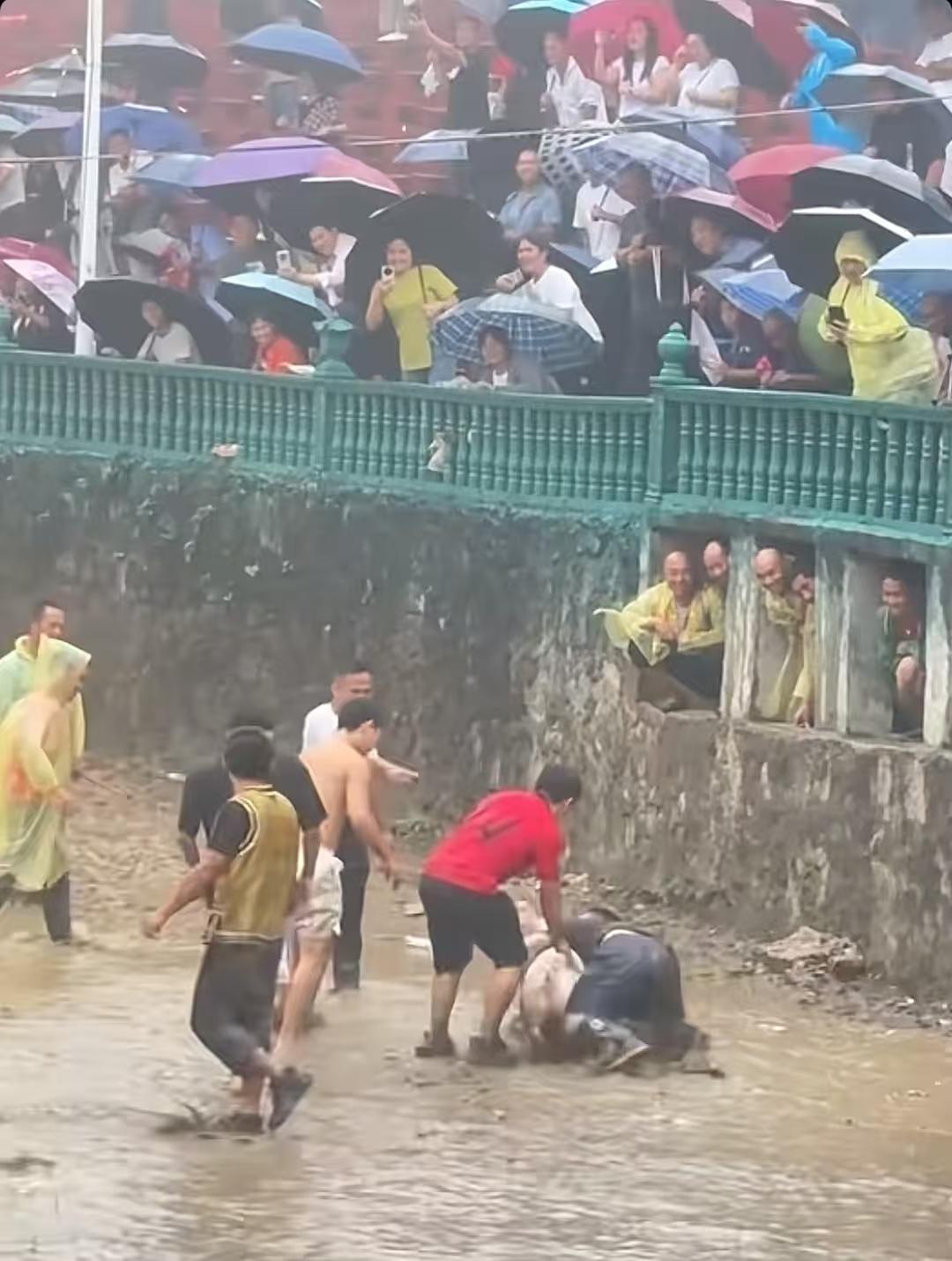 以及在泥泞的田里,比赛抓猪、拔河,风雨无阻。