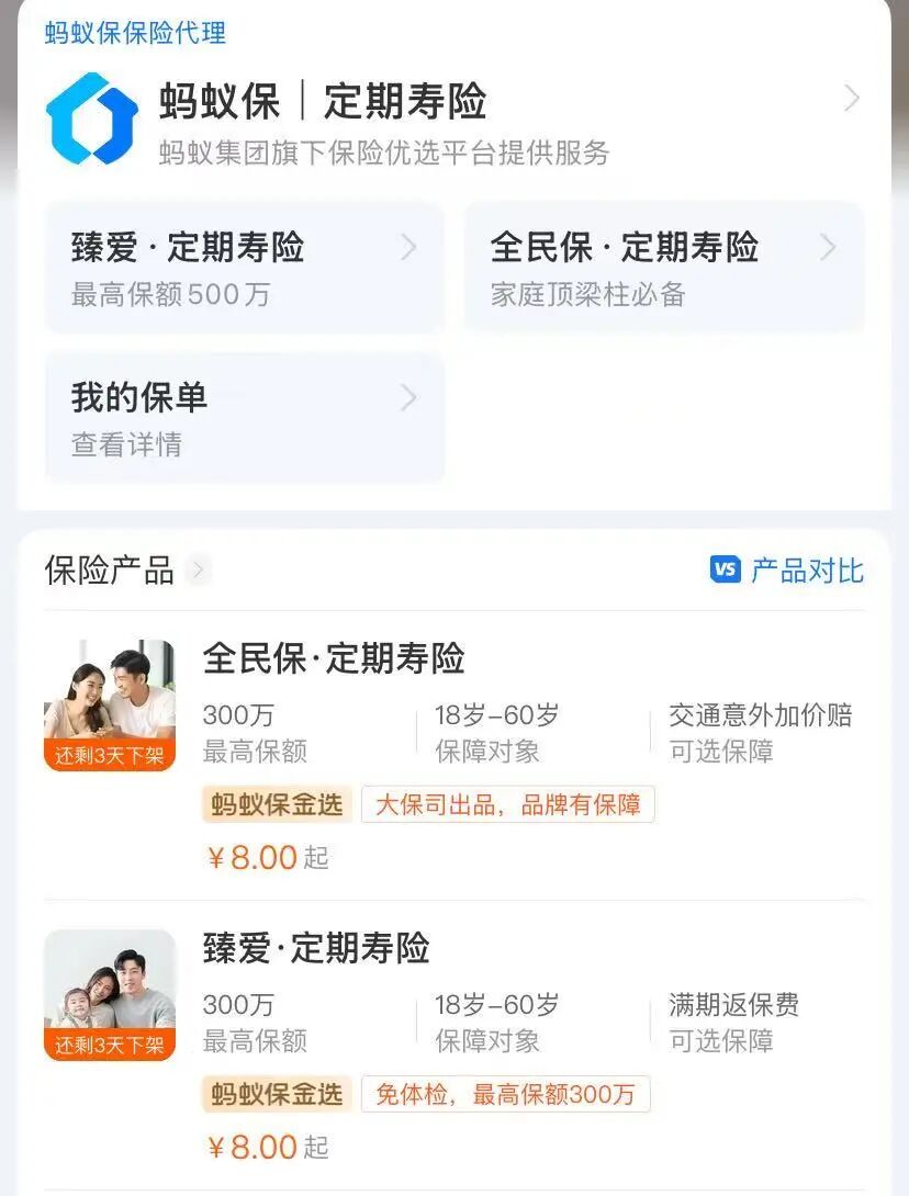 近期,蚂蚁保平台销售的两款定期寿险打出“即将下架”的标签,宣传页面称,3月1日起新产品涨价超7%。
