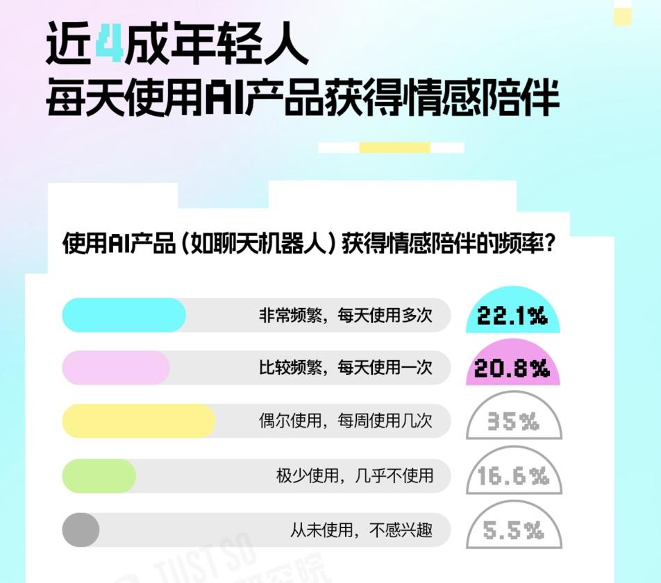 《中国青年报》调查显示,当下的生成式人工智能在青年群体中的渗透率已达51.8%,并呈现出鲜明的双重属性:有71.7%的年轻人把AI当成提效工具,更有(16.5%的年轻人把其当成求慰藉的“亲密他者”。