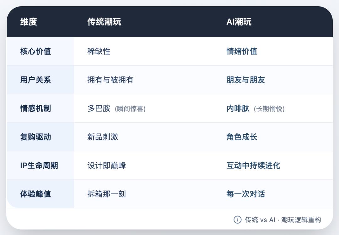 传统潮玩卖的是瞬间的确定性惊喜,AI潮玩卖的是长期的不确定性陪伴。这是两种完全不同的商业逻辑。