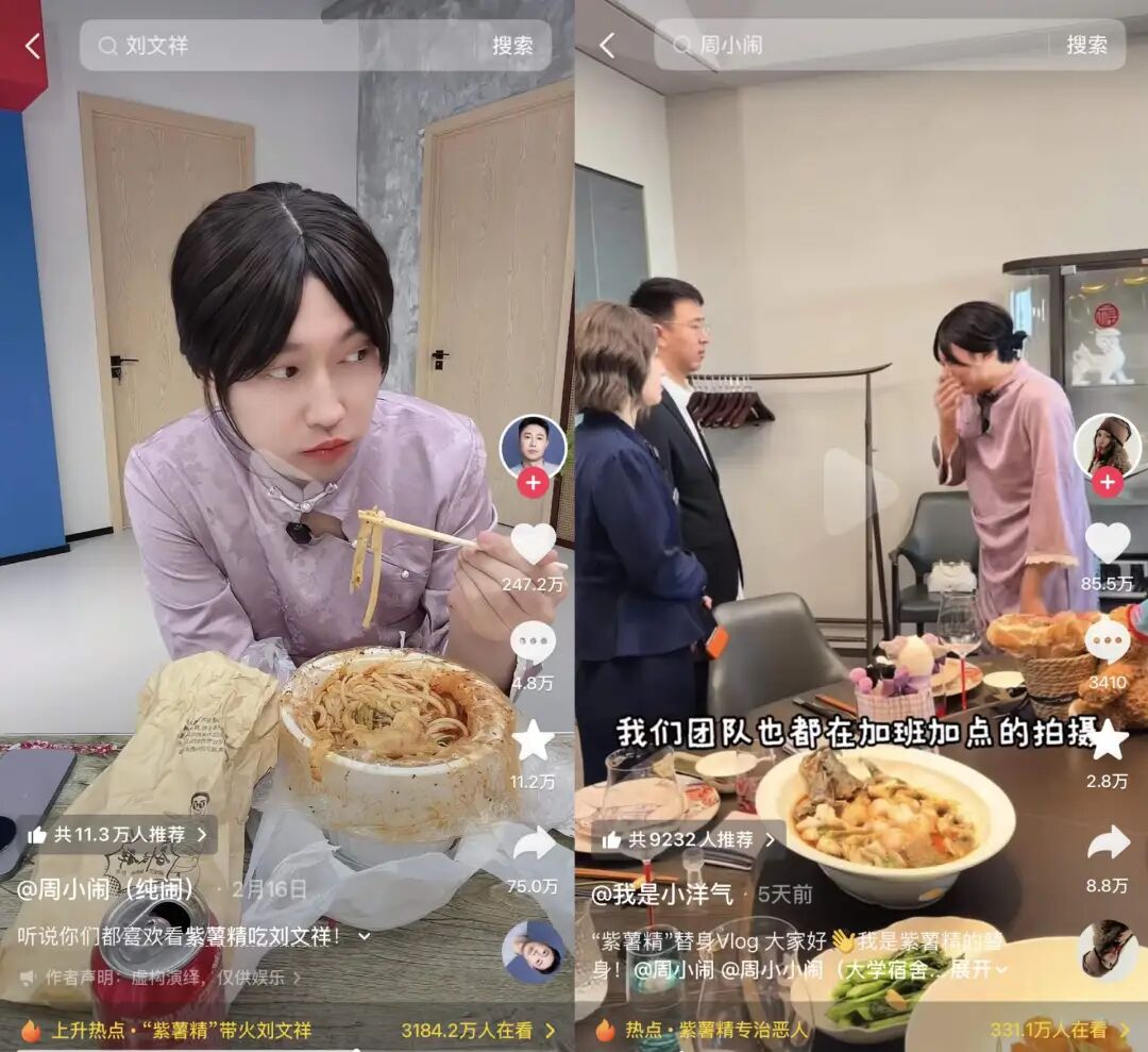 相关小号也更新起衍生视频。有的让网友对紫薯精形象有了更多层次的理解,比如“周小闹(纯闹)”发布的紫薯精一声不吭躲在角落吃刘文祥,抖音获赞247万。紫薯精的替身“我是小洋气”则从花絮揭秘的视角,分享拍摄时的趣闻。