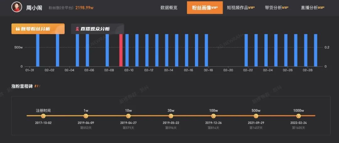 新榜数据显示,2019年底,“周小闹”的抖音账号粉丝量突破100万,收获了首批忠实受众。