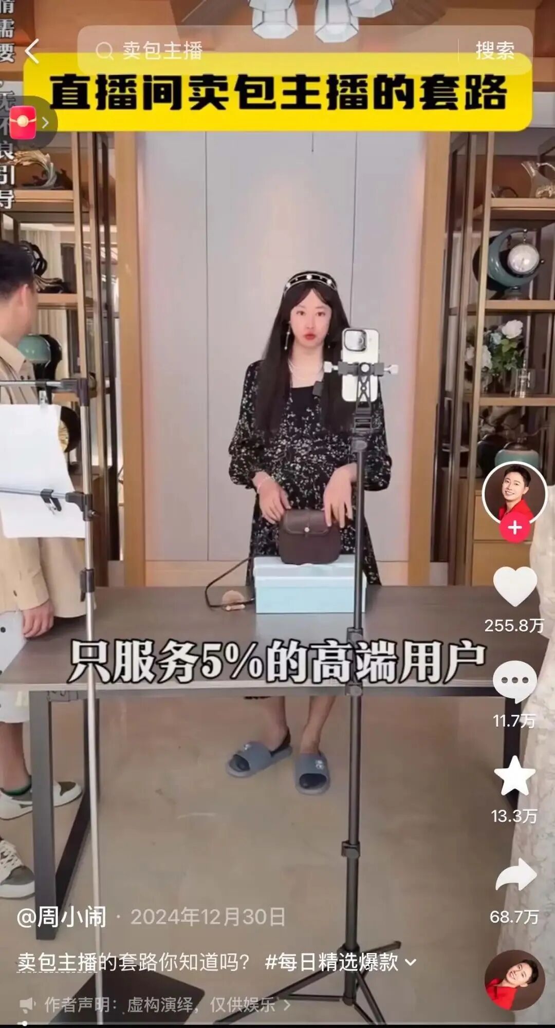 在《直播间卖包主播的套路》视频中,“周小闹”扮演的女主播玛丽,一开播就在直播间踢出2万人,称自己只服务高端用户;助理白小莲则充当“嘴替”,用内心os的形式拆穿玛丽的直播套路,吐槽她碰瓷大牌。