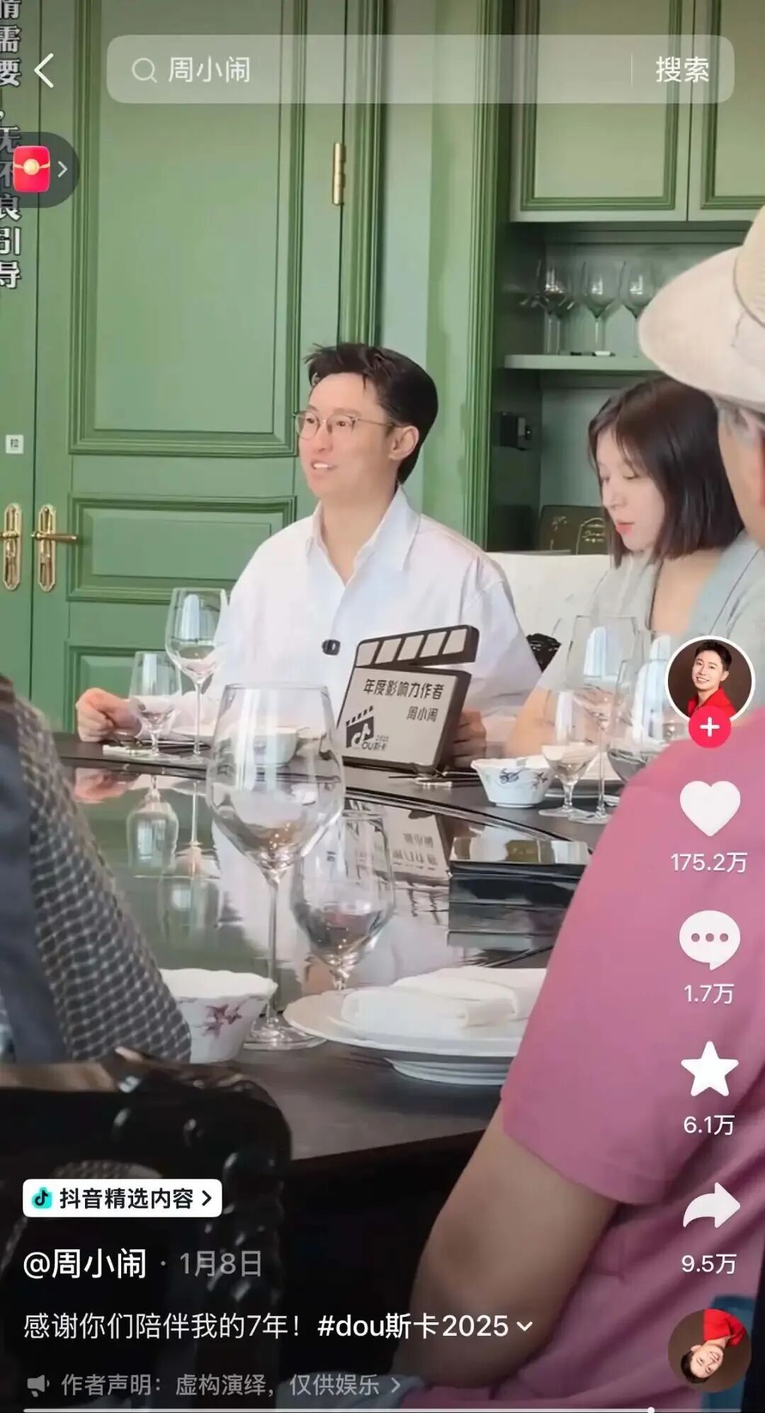 1月8日,“周小闹”还在获奖抖音年度影响力创作者的视频中,上演了一出世纪联动,邀请自己扮演过的十余位角色来小满包房吃席。