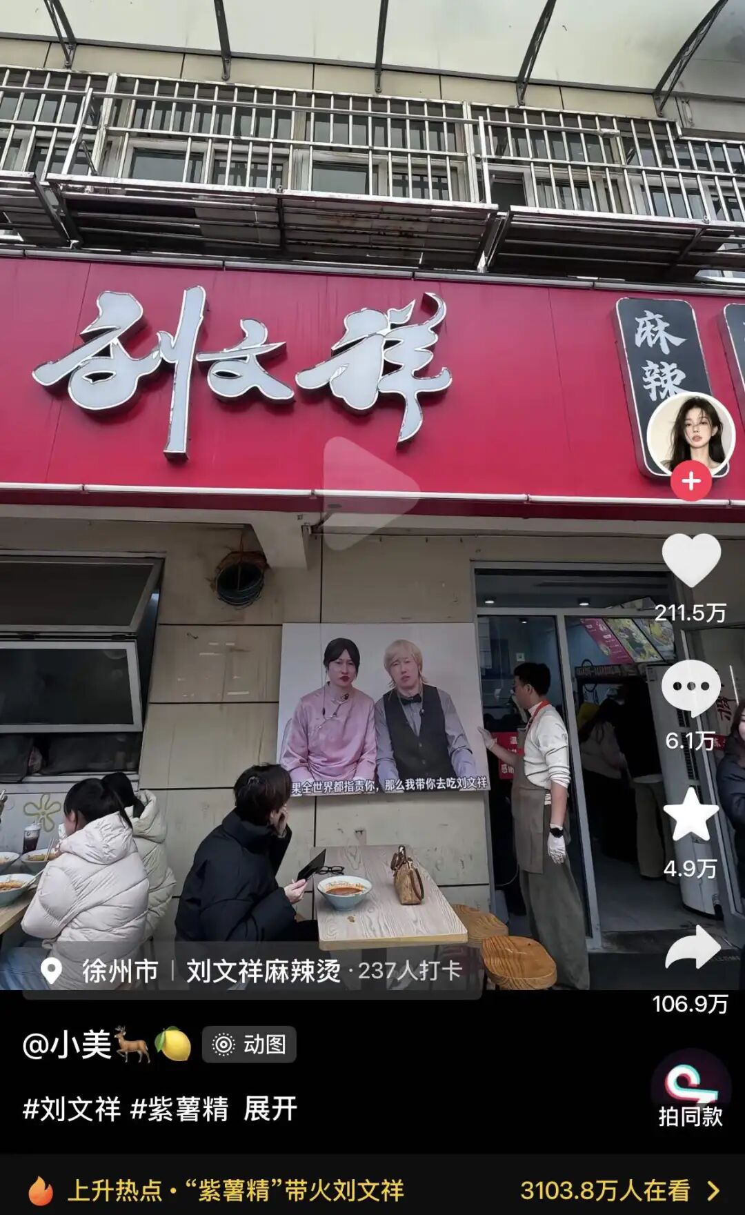 仅仅是随手拍的刘文祥麻辣烫门店照,抖音获赞211万
