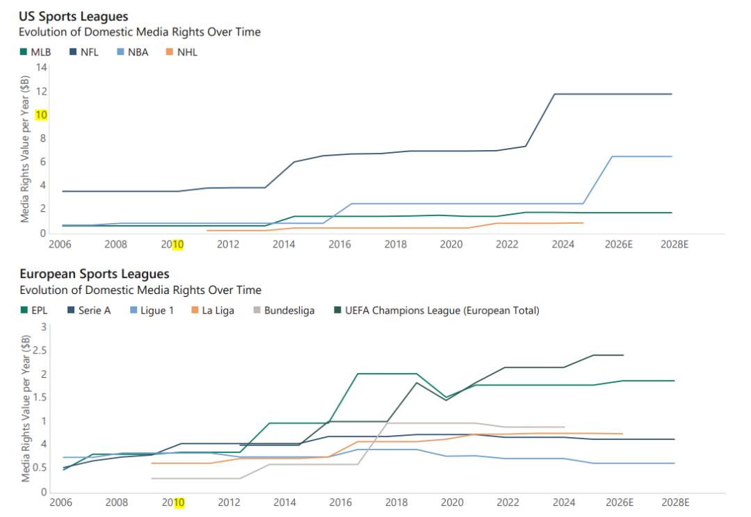 媒体版权费用的暴涨,在顶级联盟的转播合同中体现得最为直观:NFL最新为期11年、至2033年、总价值超1.1万亿美元的转播合同,金额较上一份实现了翻倍;NBA也签下了760亿美元的创纪录媒体版权合同……这股势能进而全方位推动体育产业发展:转播收入由联盟和球队共享,不仅带动俱乐部营收增长、球员薪资提升,也推高了球队估值。