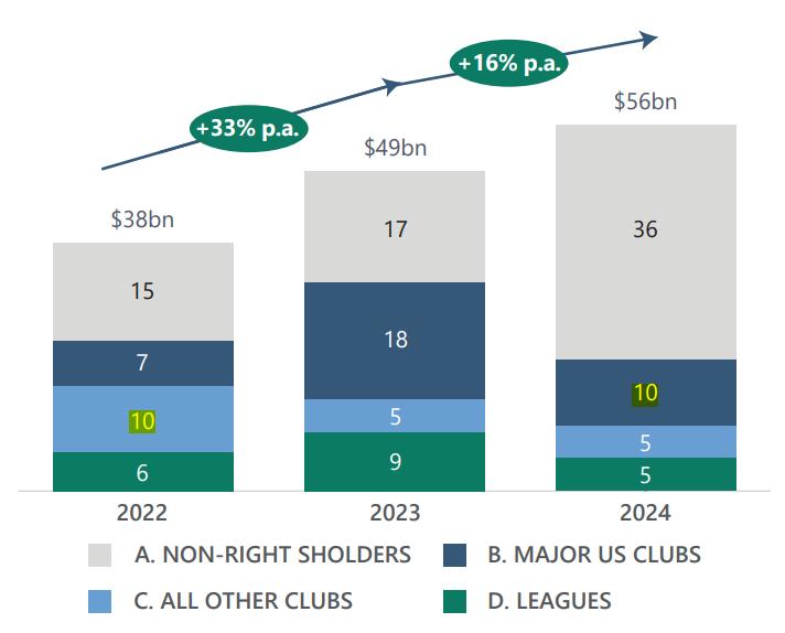 以疫情为分水岭,机构资本入局职业体育已成必然。早在疫情前,俱乐部估值飞涨就已远超个人投资者能力,媒体版权飙升与全球资本追逐将收购门槛推至历史新高,传统单一资方模式难以为继,结构失衡让更具资金规模和专业优势的投资机构入场成为大势所趋。