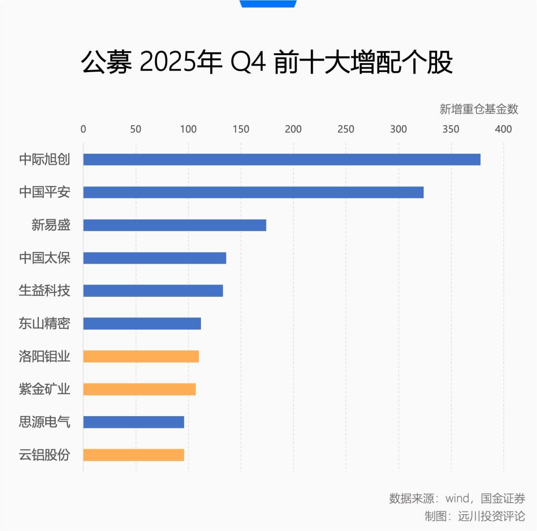 从公募基金的重仓情况来看,2025 年公募前十大增配个股中,有色行业的洛阳钼业、紫金矿业和云铝股份占据了其中的三席。从整体行业配置的增减持情况来看,有色金属也是 2025 年末公募基金增配的第一大方向。