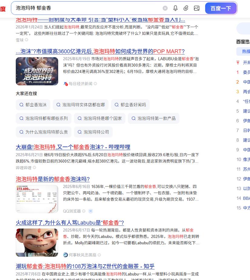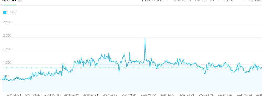 其实从百度指数来看,Molly的热度巅峰在2021年,之后迅速下滑,一度比2019年还低。从这个层面来看,它确实有点像郁金香。