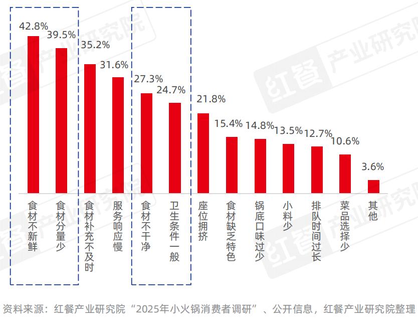 据红餐产业研究院《2025年小火锅消费调研》显示,消费者对小火锅的主要不满集中于食材和卫生层面:“食材不新鲜”“食材不干净”“卫生条件一般”问题的比例分别高达42.8%、27.3%和24.7%。这与消费者追求“质价比”的需求相背离。