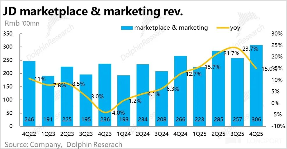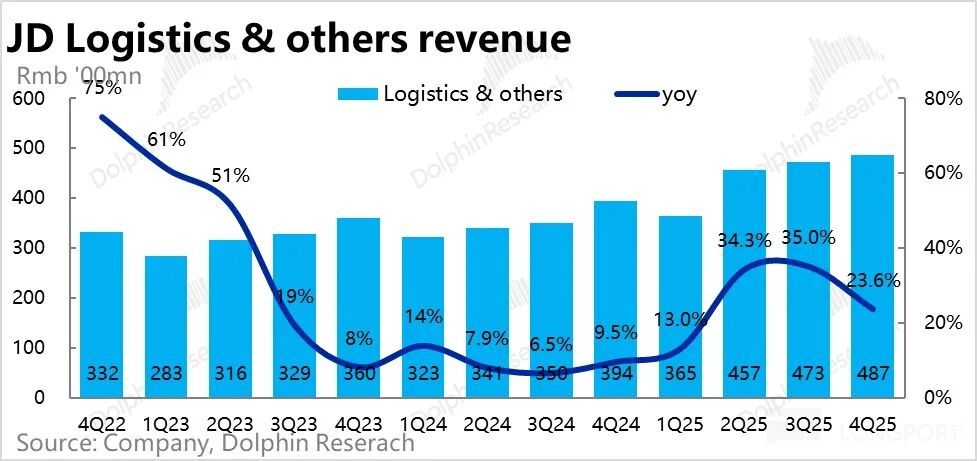 包括京东物流和闪购配送收入的物流性收入本季同比增长近 24%,较此前外卖投入高峰期 35% 左右的增速有不小的下降,隐含京东外卖&闪购的业务量确实是环比有所下滑的。