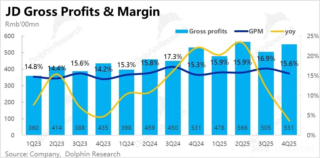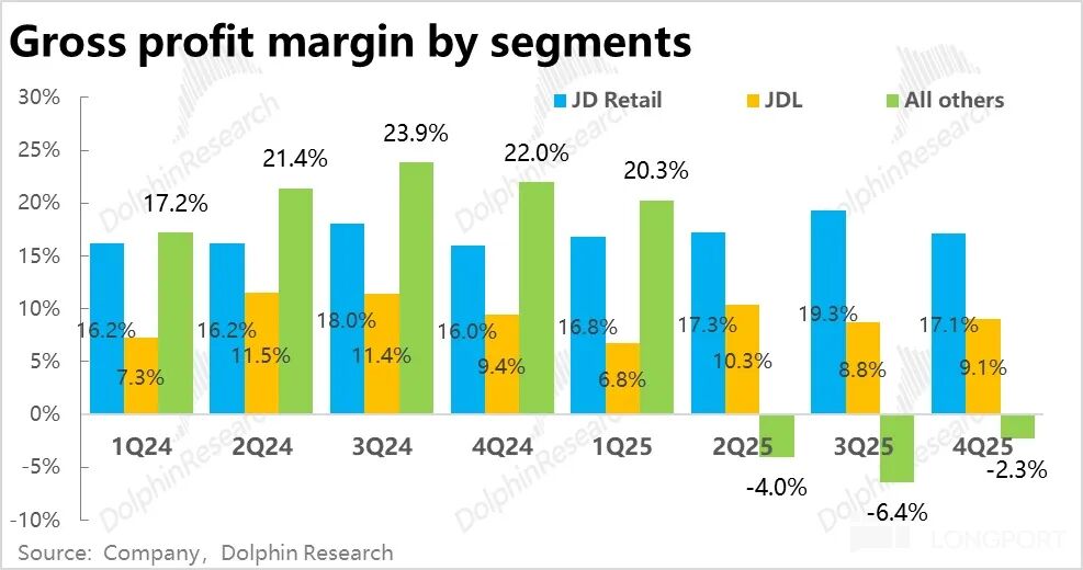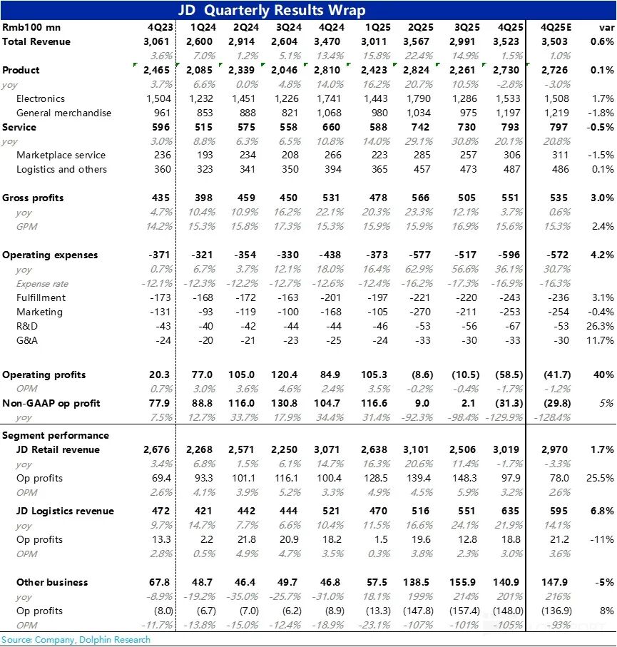 2)京东物流本季的经营利润同样略低于预期,在收入同比增长不俗的情况下,利润仅增长了 3%。基本也是闪购&外卖配送补,利润率较低、乃至是亏损的拖累。