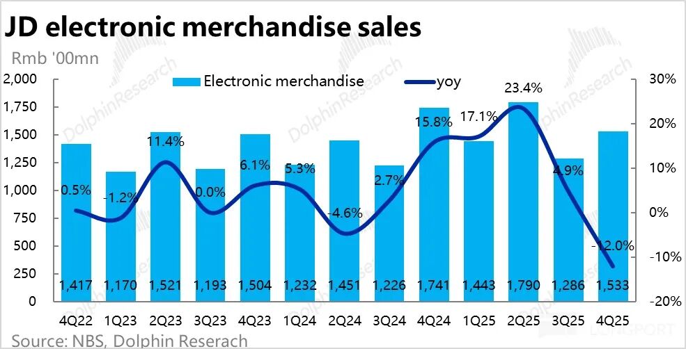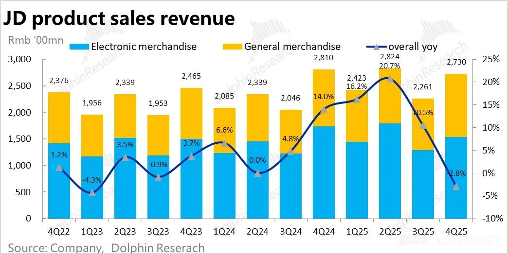 1、自营零售业务本季收入 2261 亿元,同比转跌 2.5%,跑输 10~11 月间线上实物零售约 +3% 的增长。背后原因是国补退坡&去年高基数下,通电类尤其是家电产品的销售明显萎缩。京东作为此前最受益的,如今也就受到最大的反噬。