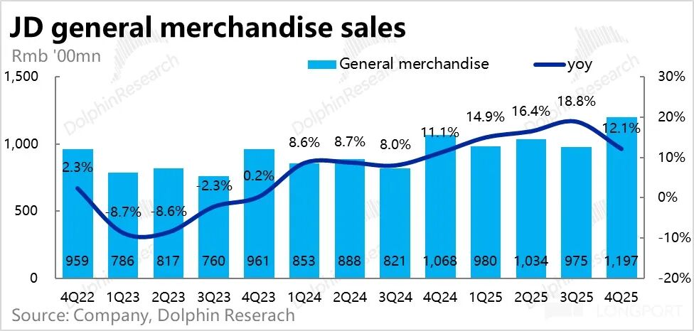1)首先在核心商城板块上,由于国补的退坡和 24Q4~25H2 的高基数,至少在 26 上半年,京东通电商品销售很可能会继续出现比较明显下滑(本季主要是家电变差,26 年手机很可能也会变成拖累)。