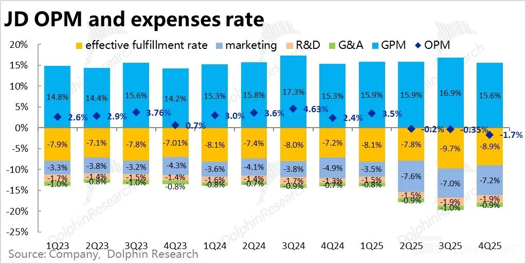 其中,主要是履约费用和营销费用的占比提升比较明显,和上文提到的闪购的运费补贴、自行出资补贴代替国补的情况是一致的。