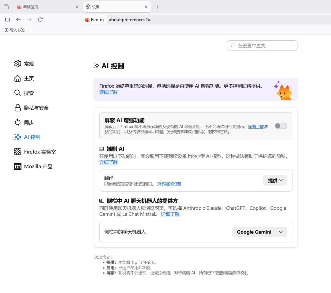 根据Mozilla官方发布的最新动态以及Firefox后续版本的更新日志,开发团队正在进一步细化用户对浏览器内AI功能的控制权。而在最新的Firefox版本中,Mozilla就已经在设置中新增了“AI控制”,明确了用户“关闭AI”的权利。