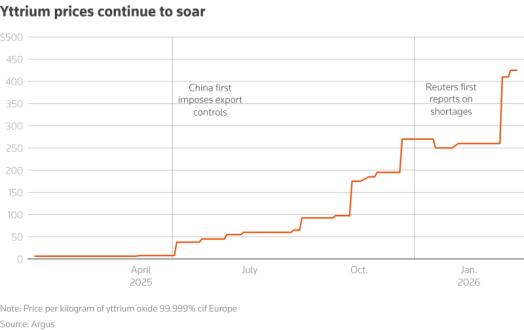 中国海关数据显示,在自2025年4月4日之后的八个月里,仅有17吨钇产品出口到美国,而此前八个月的出口量为 333 吨。由于供应受限,钇的价格大幅飙升。根据路透社的报道,自去年11月以来,钇的价格已飙升60%,目前约为去年同期的69倍。