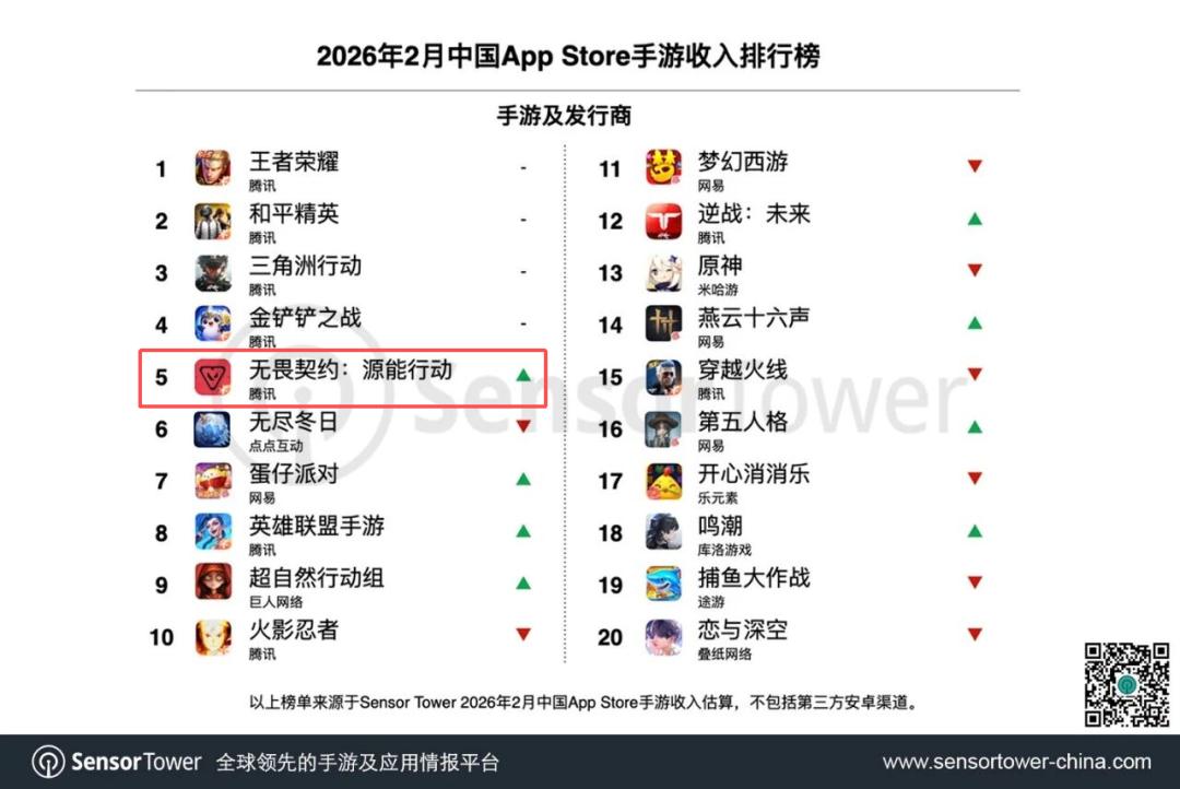 全新英雄与地图进一步夯实竞技核心,年味玩法、跨界联动与海量福利的搭配,为玩家带来兼具硬核竞技与新春氛围的沉浸式体验。该游戏本期收入大幅提升42%,创历史新高,首次跻身中国App Store手游收入榜TOP5。