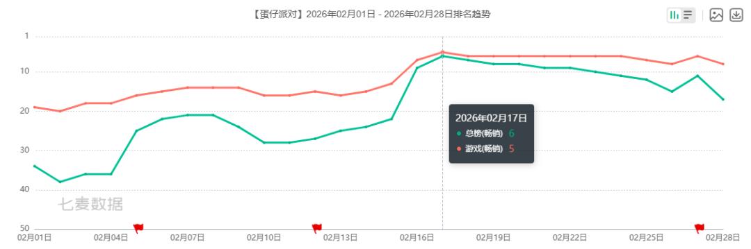 其中,《蛋仔派对》在2月16日(除夕)成功杀入畅销榜TOP10,并在次日冲进畅销榜TOP5,整个春节假期基本都保持在TOP10。