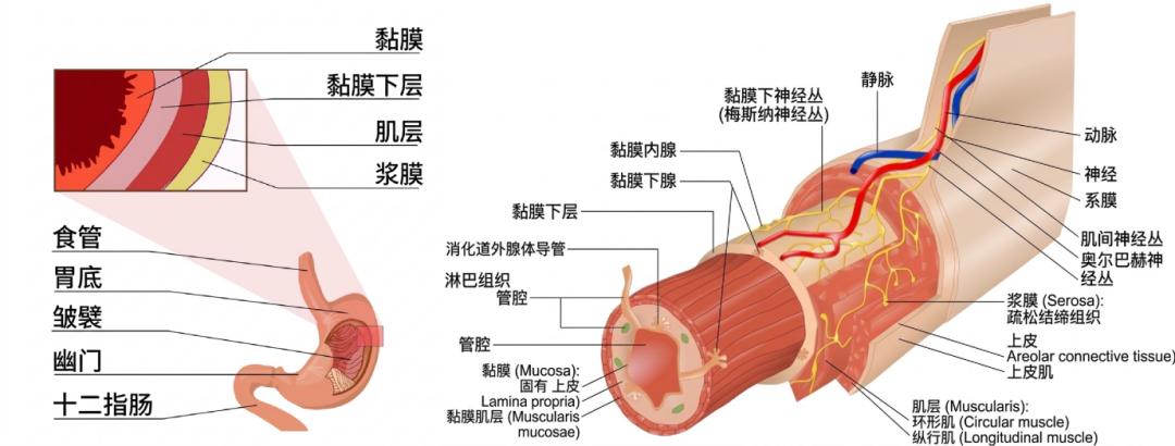 胃肠道的解剖结构。在这里胃是扩张更明显的器官,有研究发现肠道上也有扩张感受器,会让人产生饱腹感。| wikimedia commons