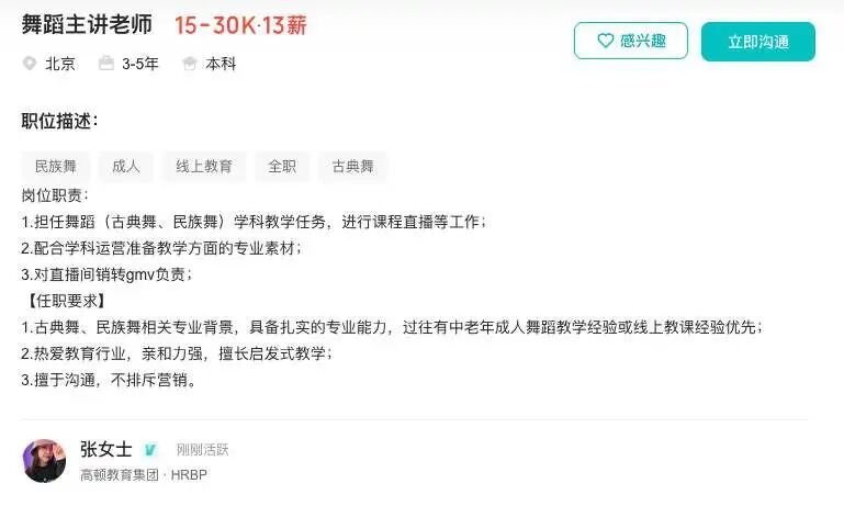 当前,高顿还在招聘舞蹈主讲老师等岗位,岗位JD中要求“担任舞蹈学科教学任务,进行课程直播等工作”,还提及“过往有中老年成人舞蹈教学经验或线上教课经验优先”。