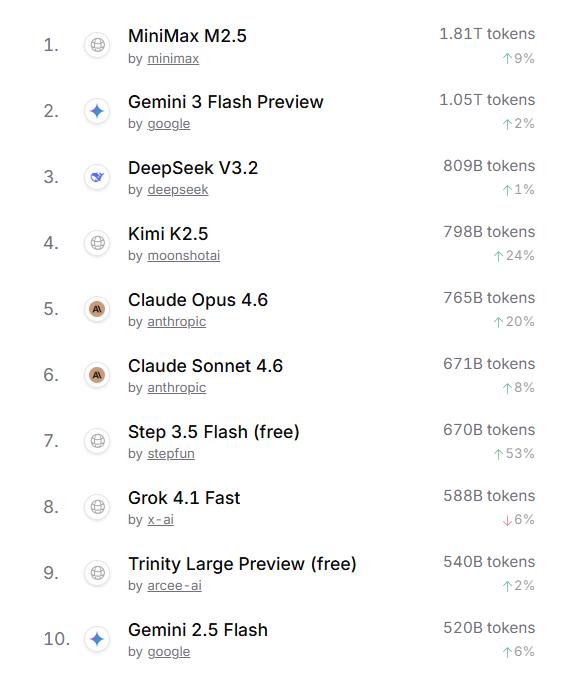 OpenRouter的最新数据显示,MiniMax的M2.5、DeepSeek的V3.2、月之暗面的Kimi K2.5、阶跃星辰的Step 3.5 Flash (free)与智谱的GLM 5,分别进入模型Token调用榜的Top 10,占据了半壁江山。