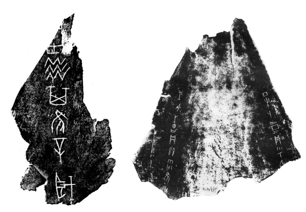 左图的甲骨文拓片,铭文可译为“会有灾祸吗?” 右图的另一块甲骨拓片,左侧铭文可译为“此雨吉否?” | 《殷墟甲骨文字合集》