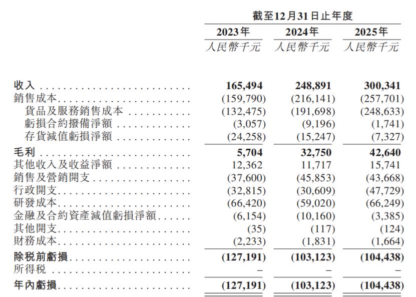 2023年、2024年及2025年(报告期),公司的收入分别1.65亿元、2.49亿元、3亿元。不过目前尚未盈利,报告期内净利润分别为-1.27亿元、-1.03亿元、-1.04亿元,三年累计亏损3.34亿元。
