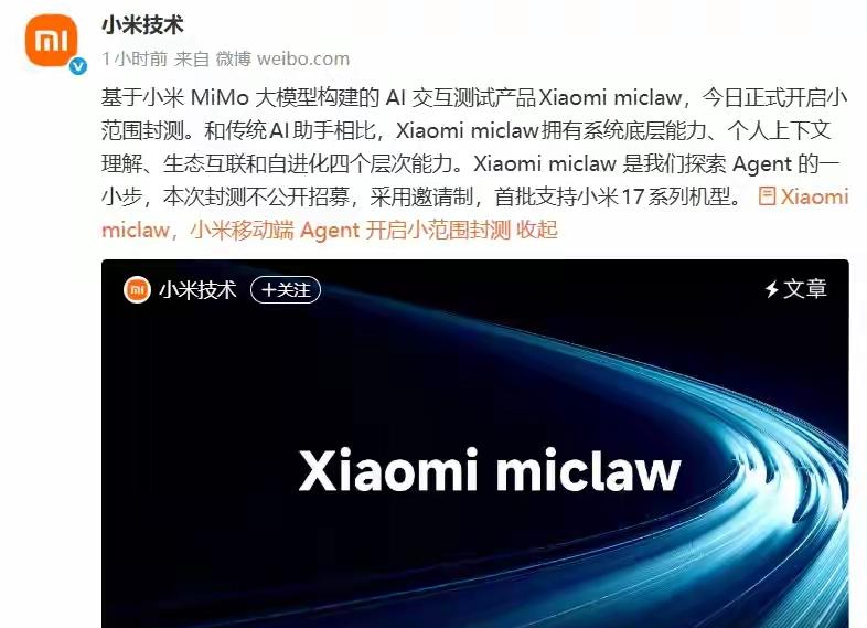 3月6日,小米推出基于MiMo大模型的Xiaomi miclaw,开启移动端封测;3月7日,美团联合联想百应推出远程部署服务。