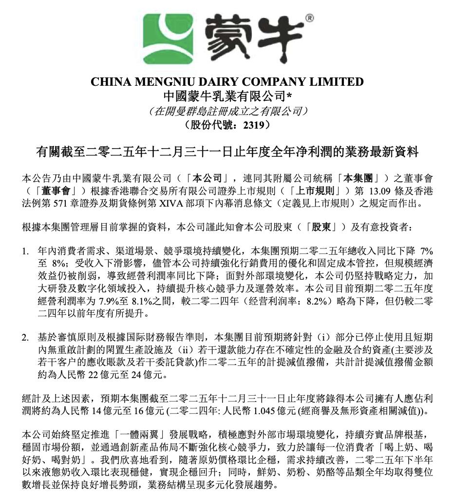 在上述因素综合影响下,蒙牛预计2025年归属于公司股东的净利润约为14亿–16亿元。