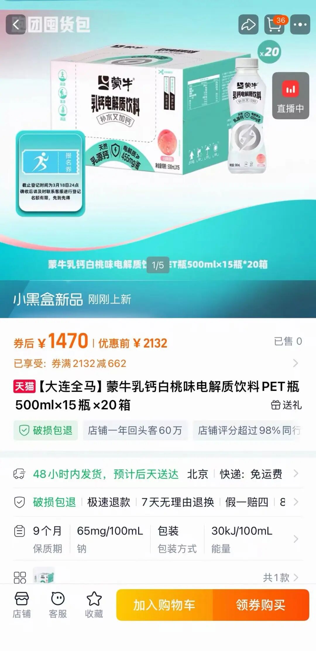 观察者网注意到,蒙牛天猫旗舰店中,这款“蒙牛乳钙白桃味电解质饮料PET瓶500mlX15瓶X20箱”的优惠前价格高达2132元,券后价格为1470元,合约4.9元/瓶。