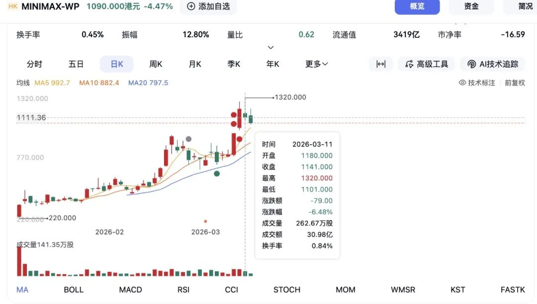 3 月 11 日,MiniMax 收跌 6.48%,股价最低时仅有 1101 港元;3 月 12 日,其股价再跌去 4.47%,收在 1090 港元。