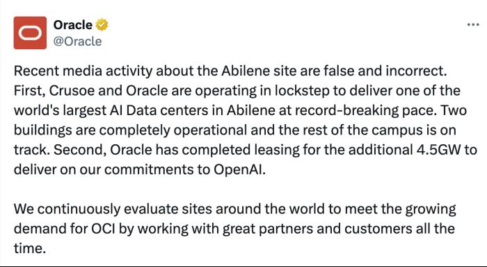 「关于阿比林(Abilene)基地的近期媒体报道是虚假且不准确的。首先,Crusoe 和甲骨文(Oracle)正步调一致地合作,以打破纪录的速度在阿比林交付全球最大的 AI 数据中心之一。目前两栋建筑已投入运营,园区的其余部分也正按计划推进。其次,甲骨文已经完成了额外 4.5GW 电力的租赁,以履行我们对 OpenAI 的承诺。