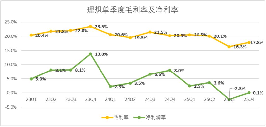 2025年第四季度,理想录得整体毛利率17.8%,单季度仅仅高于因为召回风波影响的2025年Q3。相对应的净利润率非常低,如果刨除非经常性损益,理想汽车已经连续两个季度净利率为负。