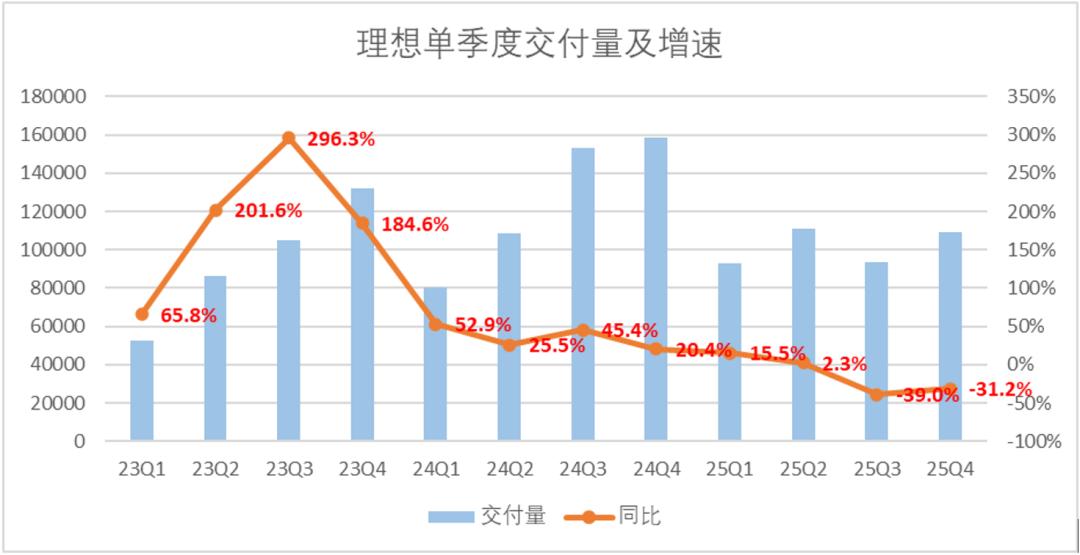 理想汽车四季度累计交付10.92万辆车,同比下降了31.2%,全年累计交付40.6万辆车,同比下降18.8%。