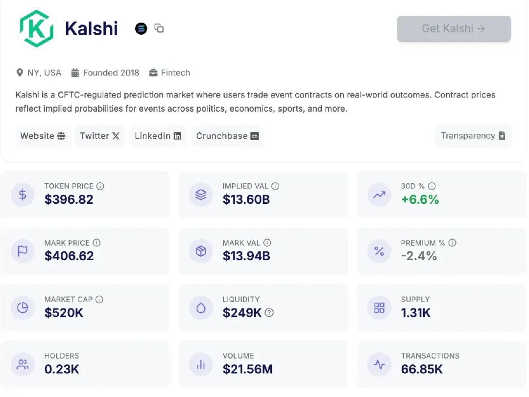 PreStocks 平台,股票代币盘前价格为 397 美元左右;(相较于我们 1 个月前在《Kalshi 交易量续破新高,盘前股价多少合理?》(https://www.odaily.news/zh-CN/post/5209330)一文中的 369 美元已增长近 30 美元,涨幅达 7.6%)