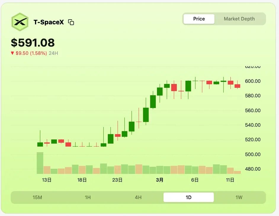 SpaceX(xAI)盘前价差:约为 75 美元,价差率 12.7%