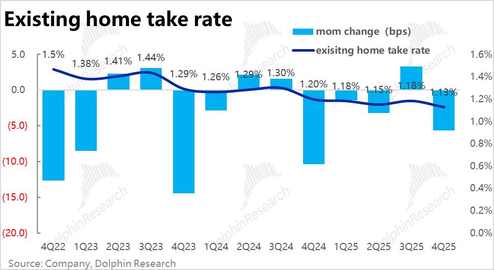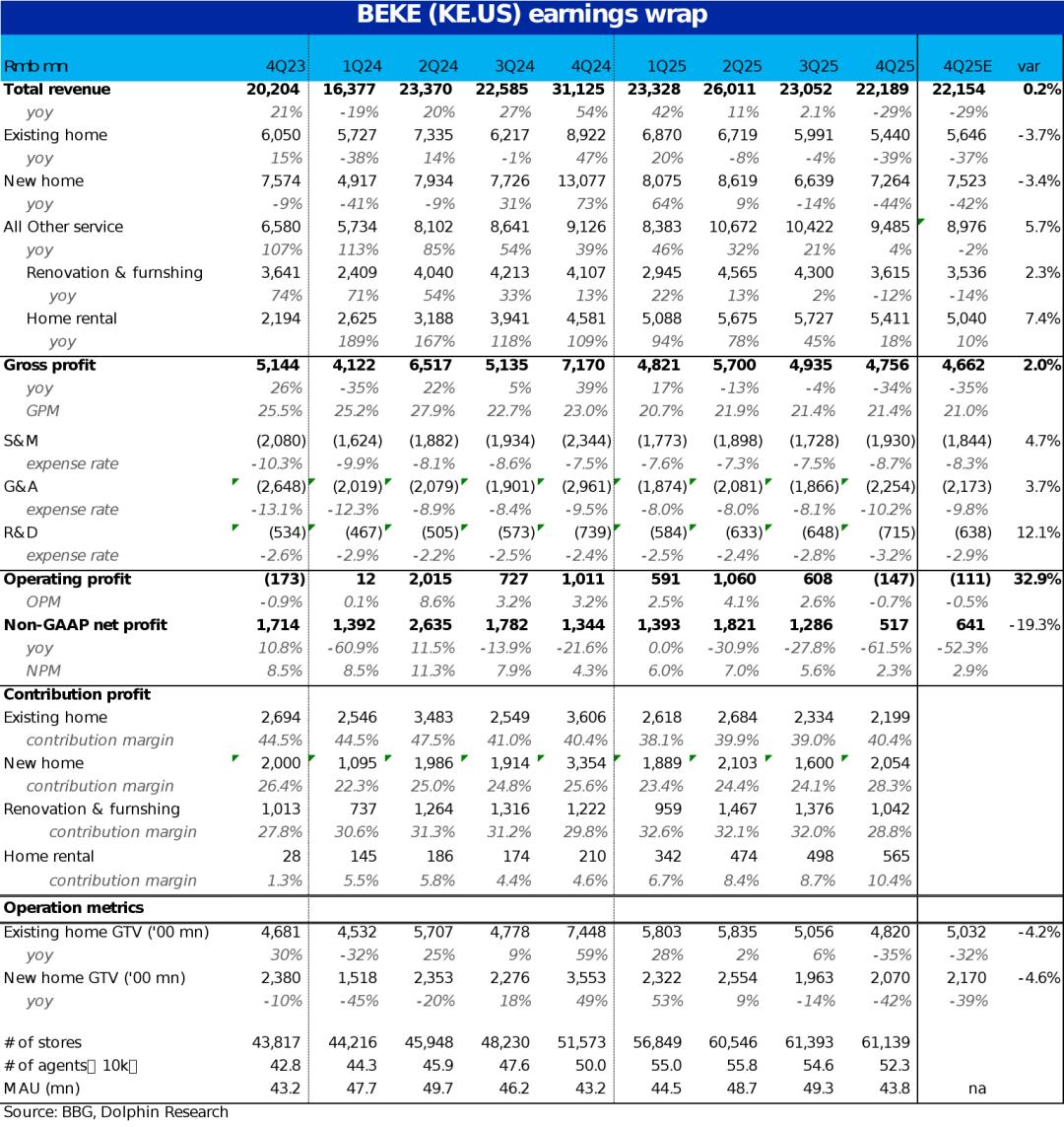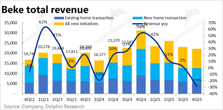 新房销售的压力则更大一些,本季GTV同比下降42%,高于彭博一致预期的39%。且根据百强房企销售数据,在25年10~12月内同比跌幅在30%~40%之间。连续多个季度可见,贝壳在新房销售上的增速已经不再跑赢行业了。
