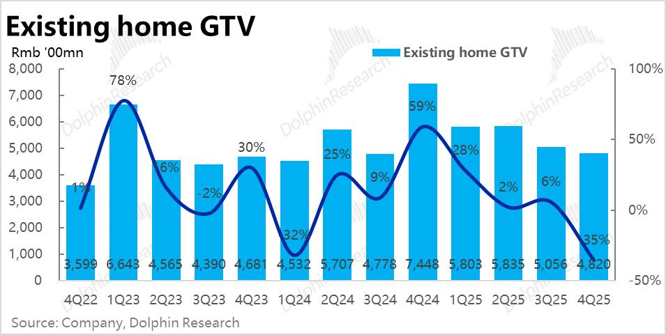 核心中核心的存量房业务,本季GTV为4820亿,同比下降35%,仍较新房相对更强(毕竟二手房在所有住宅交易中的比重在走高)。