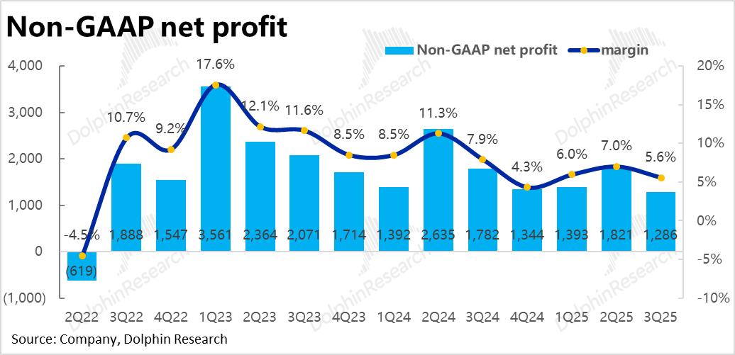同时,公司虽已加大了控费力度,本季经营费用合计同比下滑了约20%,但因收入和毛利润的同比跌幅更大,费用率被动扩大。使得本季GAAP下经营利润扭盈为亏近1.5亿。