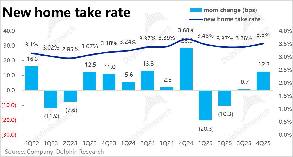 而新房业务的综合变现率本季为3.5%,环比角度因季节性有所提升(年末房企会冲销量),同比则仍下跌了17个基点,也使得收入跌幅比GTV更严重。