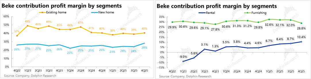 二航道内,家装业务因业务规模下滑,本季贡献利润率同比下滑了整1pct。而租赁业务则由于规模继续增长奇恩“省心租”模式的利润率更高,贡献毛利率本季继续走高。