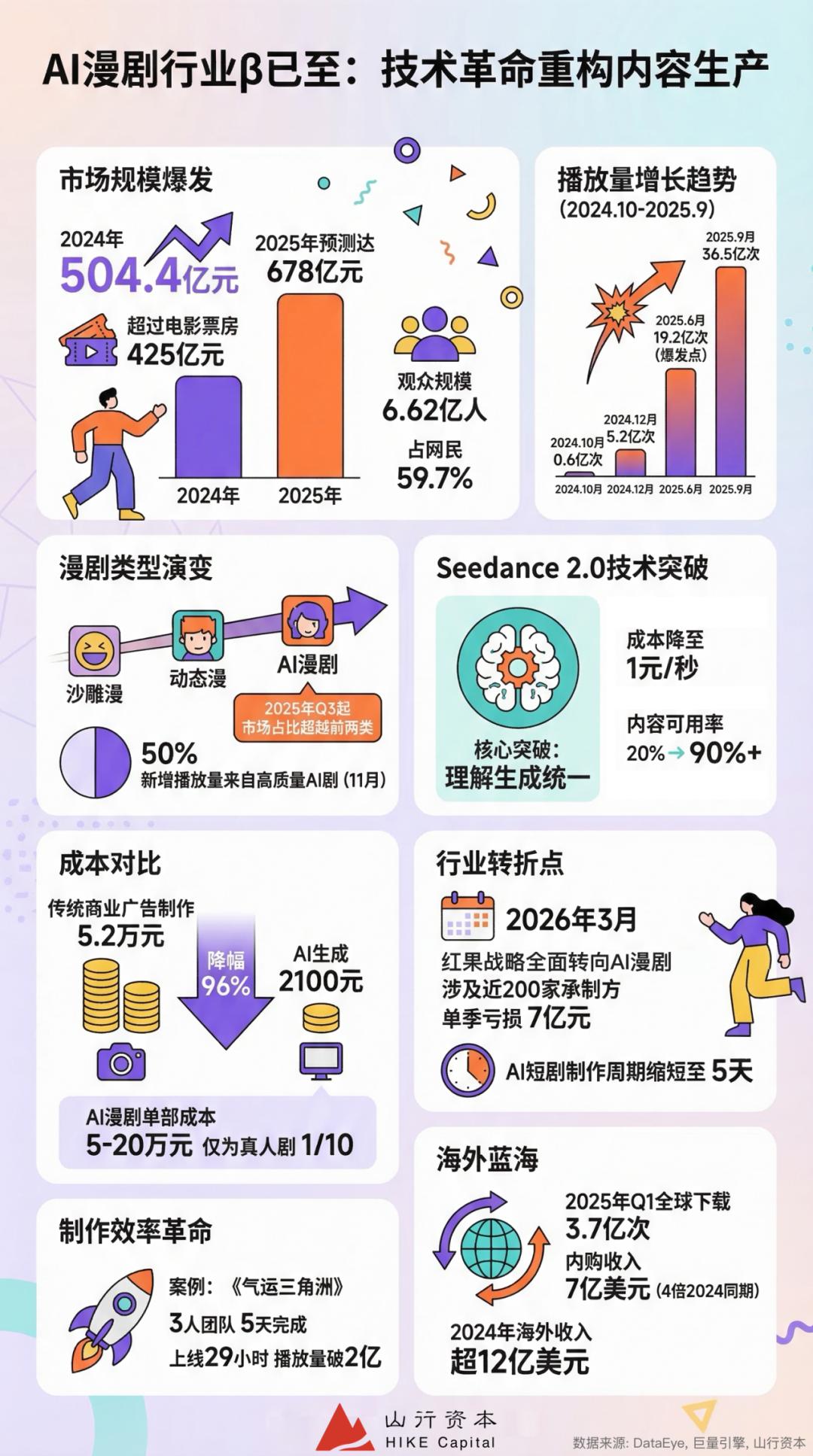 海外情况略有不同。全球短视频市场极化程度低于国内,AI漫剧在海外几乎空白,本地化内容平台存在缝隙。但进入门槛同样极高,资本效率极低,是高风险、低确定性的方向。