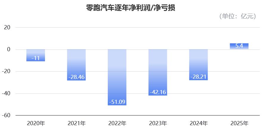 2025年,零跑汽车首次实现全年盈利,净利润为5.4亿元;而2024年同期,零跑还有28亿元的净亏损。