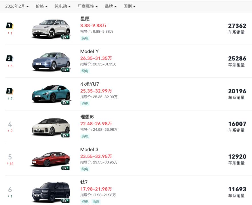 在增程销量受挫后,i6能否扛起销量大旗至关重要。2月,新能源车销量前三的车型分别为吉利星愿、特斯拉Model Y和小米YU 7,销量均在2万辆以上,i6以1.6万辆排第四。理想为i6定的后续销售目标为月均2万+,势必会跟上述爆款车型展开贴身肉搏,其结果将验证理想在纯电市场的号召力。