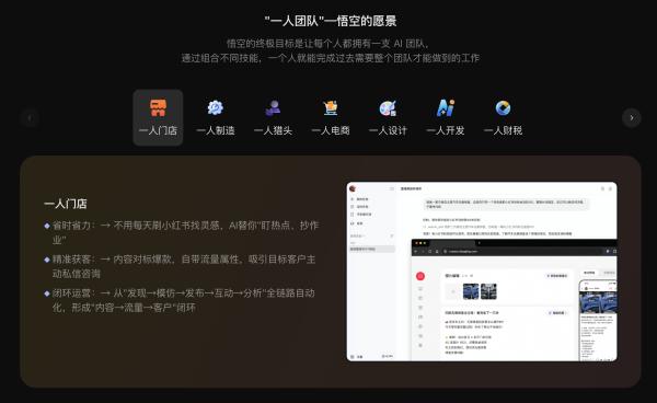 有意思的是,悟空同时推了一个叫 OPT(One Person Team,一人团队)的概念,感觉是在响应国家的 OPC(One Person Company)的号召。覆盖十个行业:一人电商、跨境电商、知识博主、一人门店、一人律师团队、一人设计团队、一人制造团队、一人财务团队、一人猎头团队、一人开发团队。