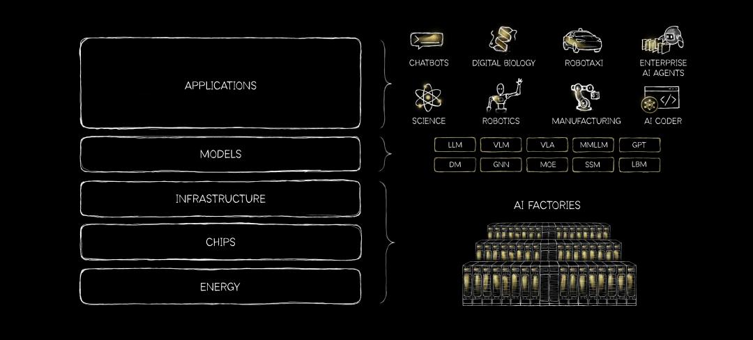 从这两个软件类产品的发布,可以看出NVIDIA并不满足于当一个单纯的AI基础设施厂商,它们渴望向AI价值链的更前端攀升。黄仁勋在GTC前写了一篇署名文章,提出了AI的“五层蛋糕”架构,现在NVIDIA就要从第四层的算力,第三层的基础设施,往第二层的模型攀登。