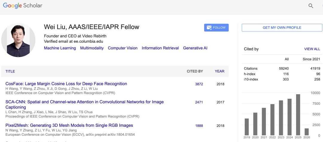 刘威曾多次担任国际权威期刊的客座编委与审稿人。离开腾讯后的一年,他和团队仍发了不少论文。Google Scholar统计,他的论文被引数超过5.9万,h-index指数高达116。