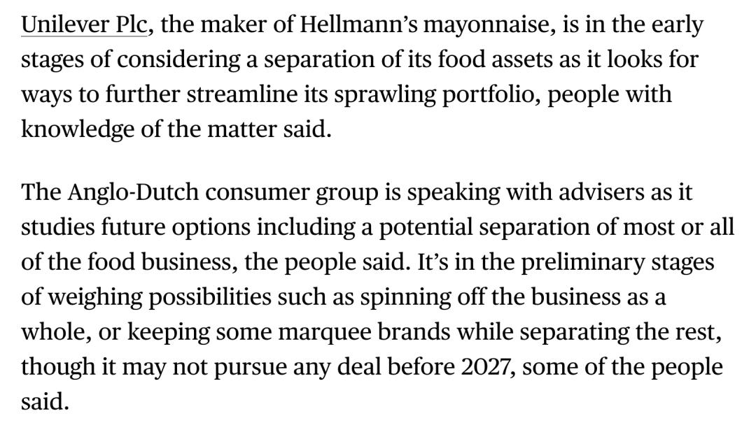 近日,据彭博社援引知情人士消息称,拥有百年历史的跨国企业联合利华(Unilever),正处于评估拆分其大部分甚至全部食品业务(即营养业务板块)的早期阶段。据知情人士透露,联合利华正与多方专业顾问紧密沟通,探讨是将食品业务整体分拆上市,还是仅保留部分具有高增长潜力的核心品牌而剥离其余资产。