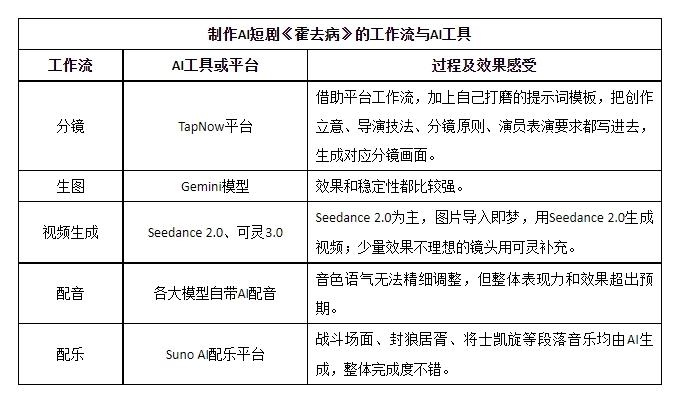 李锋详细披露了《霍去病》的制作时间及所用AI工具:10天中,前期整理资料、进行历史考证、查找参考图片约2天,实际动手进行AI制作7~8天。AI工具主要用到TapNow、Gemini、Seedance 2.0、可灵3.0等,所有工具都是用的收费版。“要想用最好的模型,确实还是收费的效果会更好一点。”李锋告诉《商界》记者。
